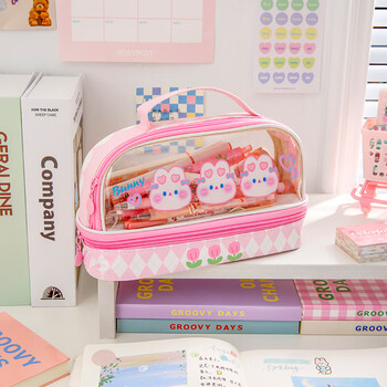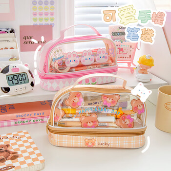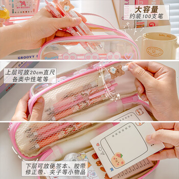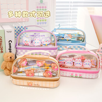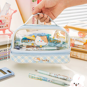 三年二班 可爱小猫兔大容量透明笔袋 小学生初高中高颜值文具盒多功能带分类文具袋 蓝色小猫