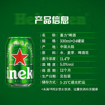 喜力啤酒(Heineken)经典330ml*24听*1箱