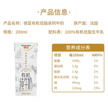 德亚(Weidendorf)进口 高钙有机纯牛奶 200ml*24盒 整箱装*1
