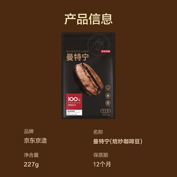 京东京造 鲜来多曼特宁咖啡豆227g 湿刨法深度烘焙精品黑咖啡SOE手冲意式