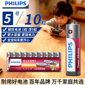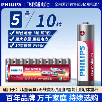 飞利浦(PHILIPS)碱性5号电池10粒干电池 十年聚能锁电适用儿童玩具鼠标智能门锁/指纹锁剃须刀血压计电池5号