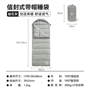 京东京造 露营睡袋 户外信封式带帽睡袋冬季保暖柔软恒温透气 岩石灰1.5kg