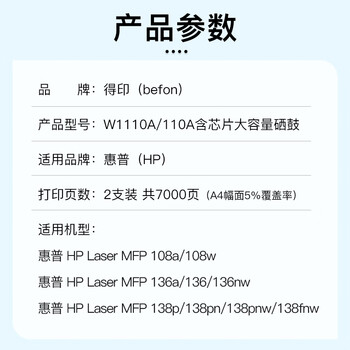 得印 W1110A 110A硒鼓大容量易加粉2支装 惠普HP 136w 136wm 136nw 108w 108a 138pnw打印机粉盒带芯片