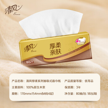 清风抽纸 厚柔4层80抽*18包M码 亲肤无刺激卫生纸抽 纸巾面巾纸 整箱