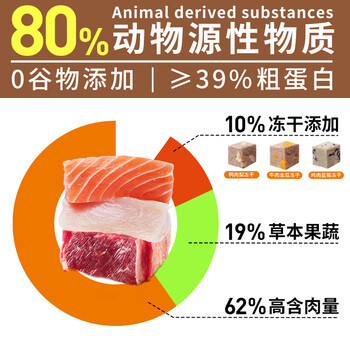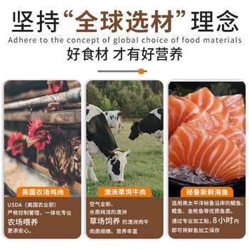 脱水鸡肉(38.3%),脱水牛肉(7.3%),脱水海洋鱼肉(6.1%),马铃薯淀粉,木薯淀粉,喷雾干燥鸭血球蛋白,新鲜鸭肉(3.8%),新鲜牛肉(3.5%),新鲜鸡肉(3.4%),鸡油,水解蛋白,鸡肝水解物,鸡肝粉甘薯干,牛油,啤酒酵母粉,梨(1.0%),金瓜(1.0%),海藻粉,甜菜粕,蓝莓(0.9%),羊油,南瓜子粉,蒙脱石,丝兰