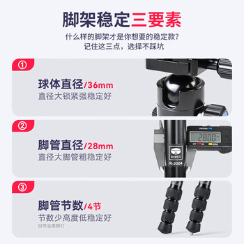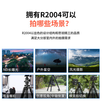 官方标配:包装盒×1、脚架包× 1、R2004三脚架× 1(含承载板,中轴挂钩,螺丝)、G20KX球型云台× 1、快装板(含螺丝)× 1、包背带× 1、附件袋(说明书质保卡/合格证/六角扳手4只)× 1