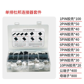1*1Pin胶壳 100个;1*2Pin胶壳 50个;1*3Pin胶壳 40个;1*4Pin胶壳 40个;1*5Pin胶壳 40个;1*6Pin胶壳 40个;1*7Pin胶壳 30个;1*8Pin胶壳 30个;1*9Pin胶壳 30个;1*10Pin胶壳 20个;公端子 400个;母端子 800个;收纳盒