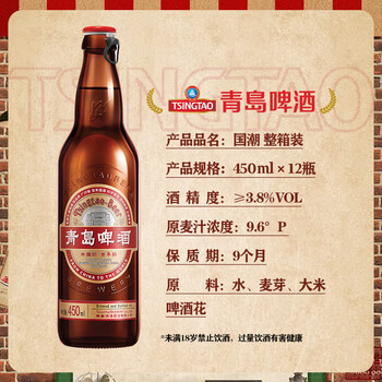 青岛啤酒(TsingTao)国潮450ml*12瓶 大瓶整箱装原麦汁浓度9.6°P