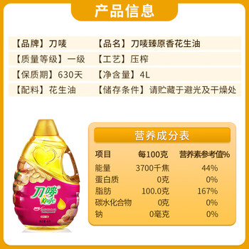 刀唛(Knife)【保真花生油】4L 臻原香物理压榨一级精炼食用油 香港品牌