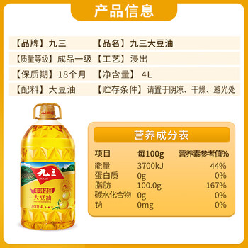 九三非转基因一级大豆油4L*1桶
