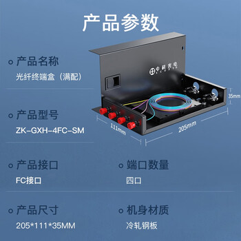 中科光电 光纤终端盒4口 4芯光纤熔接盒 光缆接续盒 接线熔纤盒 FC单模满配尾纤法兰 壁挂式 ZK-GXH-4FC-SM