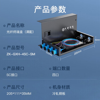 中科光电 光纤终端盒4口 4芯光纤熔接盒 光缆接续盒 接线熔纤盒 SC单模满配尾纤法兰 壁挂式 ZK-GXH-4SC-SM