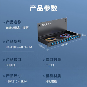 中科光电 光纤终端盒12口24芯光纤配线架 光缆接续盒接线熔纤盒LC单模满配尾纤法兰 机架式 ZK-GXH-24LC-SM