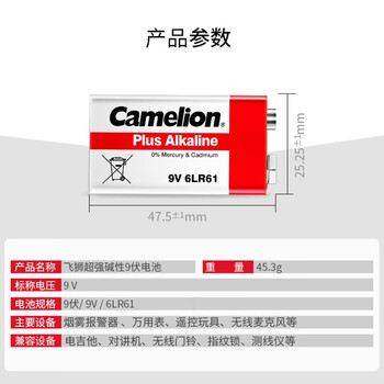 飞狮(Camelion)碱性电池 干电池 6LR61/9V/9伏 电池 6节 万用表/烟雾报警器/话筒/麦克风/医疗仪器