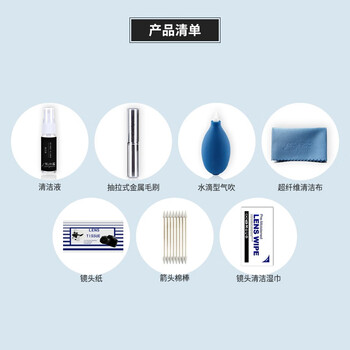 水滴气吹×1 尖头无尘双头棉签×8 抽拉式金属毛刷×1 超细纤维镜头布×1 清洁液×1 镜头纸x1 湿纸巾x5