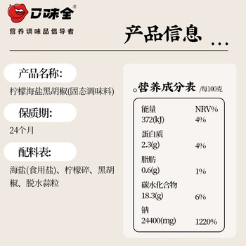 口味全 柠檬海盐黑胡椒粒研磨碎粉瓶128g西餐牛排烧烤鸡胸肉健身餐调料