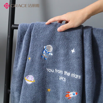 洁丽雅(Grace)A类浴巾家用纯棉刺绣速干吸水成人男女加厚裹巾灰色星球135*70cm
