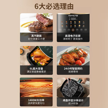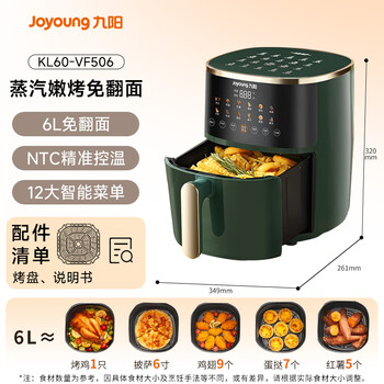 九阳(Joyoung)空气炸锅家用不用翻面 6L大容量免翻面全息触控 金属内腔 无油低脂煎炸蒸烤一体机KL60-VF506