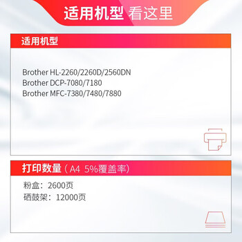 | 适用机型 | HL-2260D;HL-2260;HL-2560DN;DCP-7080;DCP-7080D;DCP-7180dn;MFC-7380;MFC-7480D;MFC-7880dn;LJ2400 Pro;LJ2400Pro;M7400 Pro;M7400Pro;M7450F Pro;LJ2405;LJ2405D;LJ2455D;LJ2605D;LJ2655DN;M7405D;M7605D;M7615DNA;M7455DNF;M7655DHF;M7675DXF;M7400W;M7405dw;M7605DW;M7625DWA;M7626dna;M7628dna;M7685DXF;M7686DXF;P228db;P268B;P268D;P268DW;M228b;M228db;M228FB;M228Z;M268DW;M268z;DCP7080D;2600P;Bizhub 2600P;Bizhub 3000mf;3000MF;3080MF;Bizhub 3080MF;M7480D |