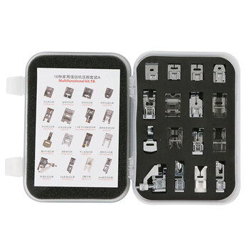 16种组合压脚套盒x1+风琴弹力针x1袋(5支装)+三轴线架x1+涤纶线x1+保养油x1+梭芯x1盒(10个)x1+机针X4板(10支装)