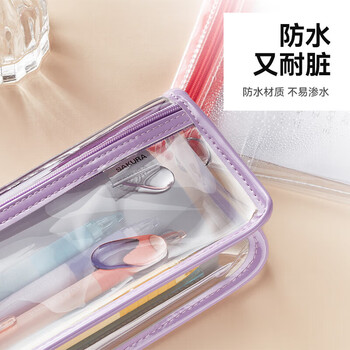 樱花(SAKURA)透明考试笔袋双拉链简约男女学生用大容量中高考笔袋糖果色小清新防水文具盒-珊瑚红
