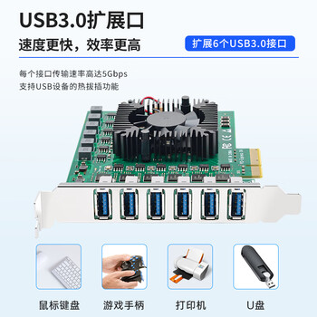 特点 理论传输速度比高速USB 2.0快10倍,提供后置4个USB3.0接口 提供前置2个19PIN接口;独立免供电 规格 符合PCI Express 2.0版本规范 符合USB 3.0 1.0版本规范 向下兼容USB 2.0接口和PCI-Express 1.0版本 支持以下数据传输率; 加装USB设备保护电路 -USB2.0模式下高达480 Mbps的传输速率 -USB3.0模式下可达5 Gbps的传输速率 驱动支持Windows 8, Windows 7/Vista/XP,Server 2008 R2 32/64-bit
