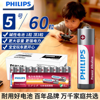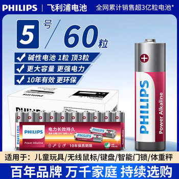飞利浦(PHILIPS)碱性5号电池60粒/10粒干电池 十年聚能锁电适用儿童玩具鼠标智能门锁/指纹锁剃须刀血压计电池5号