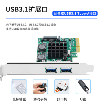 特点 理论传输速度比高速USB 2.0快10倍,提供1个USB3.1接口,提供1个Type-C接口;独立免供电 规格 符合PCI Express 2.0版本规范 符合USB 3.1 1.0版本规范 向下兼容USB 3.0接口和PCI-Express 1.0版本 支持以下数据传输率; 加装USB设备保护电路 -USB2.0模式下高达480 Mbps的传输速率 -USB3.0模式下可达5 Gbps USB3.1模式下可达10 Gbps的传输速率 驱动支持Windows 8, Windows 7/Vista/XP,Server 2008 R2 32/64-bit