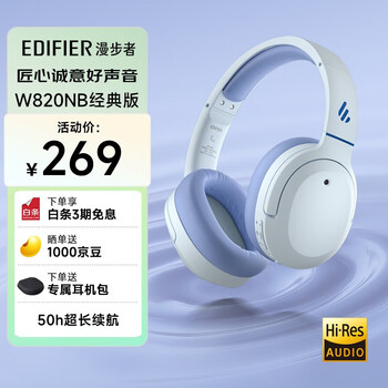 漫步者(EDIFIER)W820NB经典版 头戴蓝牙主动降噪耳机 金标认证 手机电脑笔记本耳机 湖光蓝