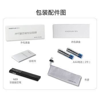 诺为翻页笔(尾部有接收器) × 1 说明书保修卡 × 1 7号电池AAA × 2 绒布收纳袋 × 1 品牌包装盒× 1
