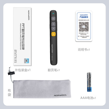 诺为翻页笔(尾部有接收器) × 1 说明书保修卡 × 1 7号电池AAA × 1 品牌包装盒× 1