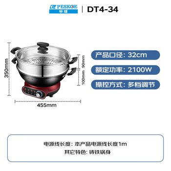 半球(Peskoe)电蒸锅定时款电炒锅加厚铸铁电锅多用途锅多功能电热锅 电火锅电煮锅DT4-34