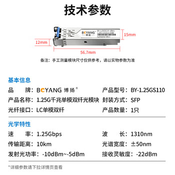 博扬SFP光模块千兆1.25G单模双纤(1310nm,10km,LC)适配华为交换机SFP-GE-LX-SM1310*1 合格证*1 保修卡*1