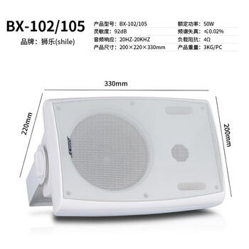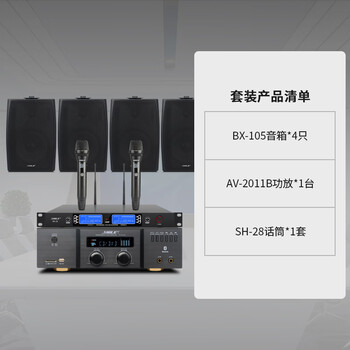 狮乐AV-2011B功放 × 1、SH-28无线话筒 × 1、BX-105壁挂音箱 × 4、遥控器 × 1、说明书 × 1、保修卡 × 1