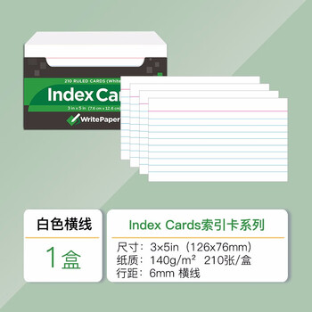 产品名称:凯萨美式索引卡办公分类卡片纸 白色横线 产品货号:KS-5255 产品规格:210张/盒 产品尺寸:126mm*76mm*35mm