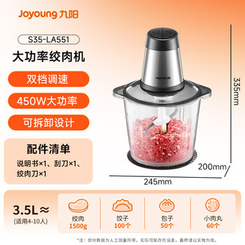 九阳(Joyoung)绞肉机家用电动多功能料理机婴儿辅食机切菜绞馅不锈钢碎肉3.5升大容量 S35-LA551