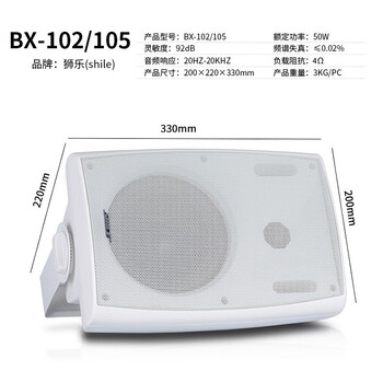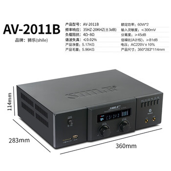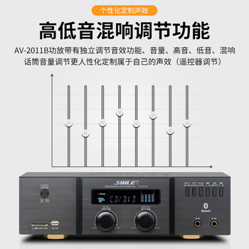 狮乐AV-2011B功放 × 1、BX-105壁挂音箱 × 2对、音箱线24米× 1、遥控器 × 1、说明书 × 1、SH-10话筒一套(选购) × 1、保修卡 × 1