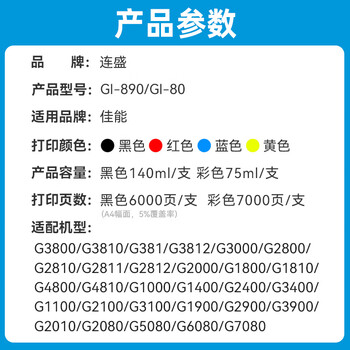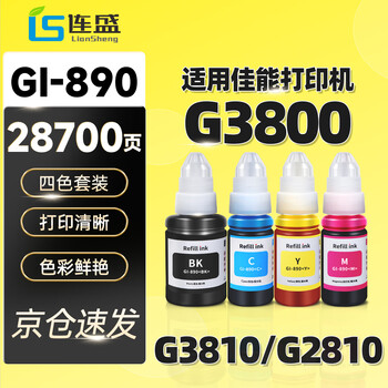 连盛适用佳能G3800 G2810 G1810 G3810 G2800 G3000 G3812 G4810 2010 canon打印机墨水 GI-890/80四色