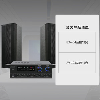 AV108功放1台、BX404音箱2只、音频线2条、音箱线12米、说明书 × 1、保修卡 × 1;