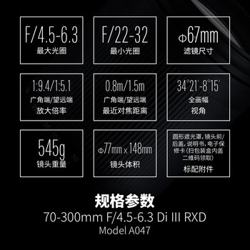 腾龙(Tamron)A047S 70-300mm F/4.5-6.3 Di III RXD远摄长焦变焦 体育动物 索尼全幅微单镜头(索尼全幅E口)
