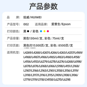 绘威适用爱普生L4266 L4168 L4268墨水L4166 L4269 4158 4160 4168 4263 6178 6279 epson打印机002墨水 黑色