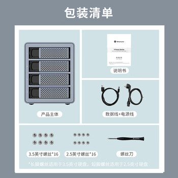 Yottamaster FS4RU3的配件非常全面,除了硬盘柜本体外,还有一根电源线、一根USB type-B转type-A数据线、一把小螺丝刀、一包3.5英寸硬盘螺丝包、一包2.5英寸硬盘螺丝包和一本说明书,配套全面,到手即可安装。