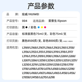 绘威适用爱普生004墨水L3251 L3258 L3255 L3153 L1258 L1259 L3158 3151 3156 3556 3256 epson打印机墨水 四色