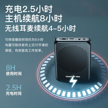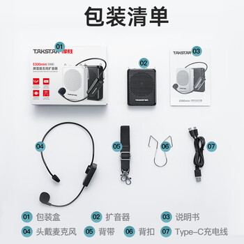 • E300mini无线版扩音器*1台 • 无线头戴麦克风(30天质保)*1个 • 背扣*1个 • 腰带*1条 • 一分二充电线(Type-C和Micro USB) *1条 • 说明书*1份 (注:所有线材、电源适配器、电池等易消耗品不在保修范围内)