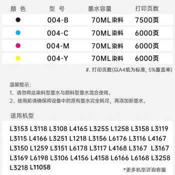 天威004墨水适用爱普生打印机墨水L3251 L3255 L3258 L3256 3558 3556 3266 3153 3268 3158 3219 3253 1258黑色