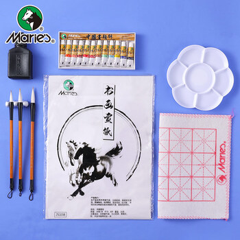 马利(Marie's)国画颜料盒装12色5ml水墨画山水画学生初学者套装毛笔墨汁调色盘毛毡宣纸专业国画颜料套装