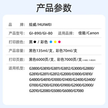 绘威GI-890/80墨水 适用佳能G3800 G2810 G1810 G3810 G2800 G3000 G3812 4810 2010 canon打印机墨水2黑3彩