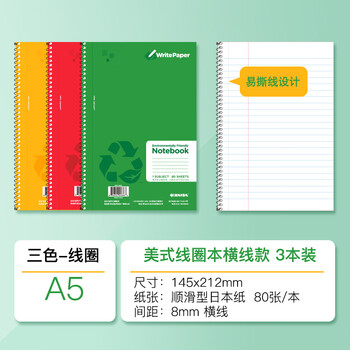 凯萨(KAISA)线圈笔记本三色横线笔记美标A5 × 3