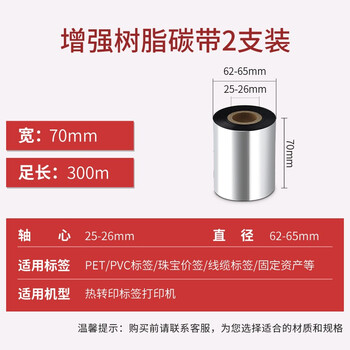 得印70mm*300m单轴碳带两支装 增强树脂碳带 条码打印机专用色带 标签带 热转印标签打印机通用碳带