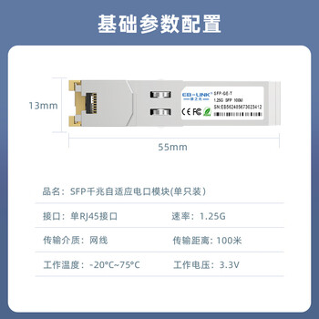 EB-LINK SFP千兆自适应电口模块光口转RJ45电口1.25G光纤模块100米兼容华为/锐捷/中兴/海康